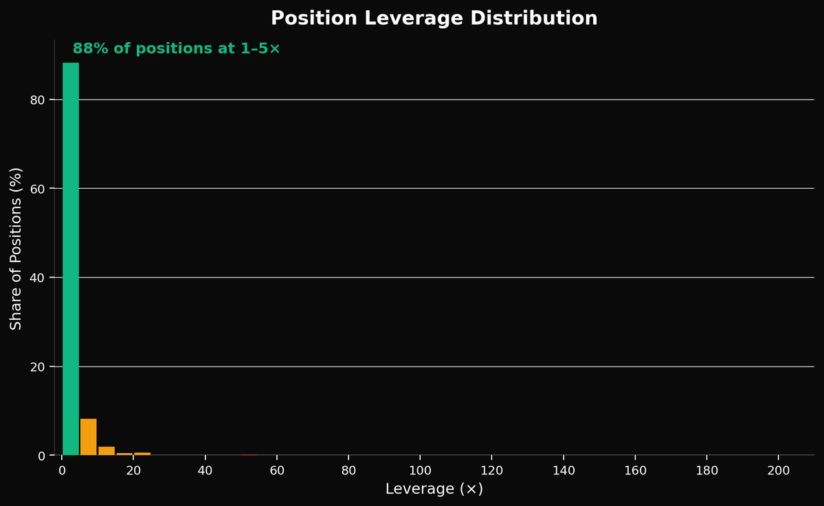 Just as notable is the leverage discipline. Average leverage across the user base sits in the 2-4x range, far below the 10-200x maximums the platform allows. That is the kind of measured sizing one would expect from someone expressing a market view with a defined risk budget.