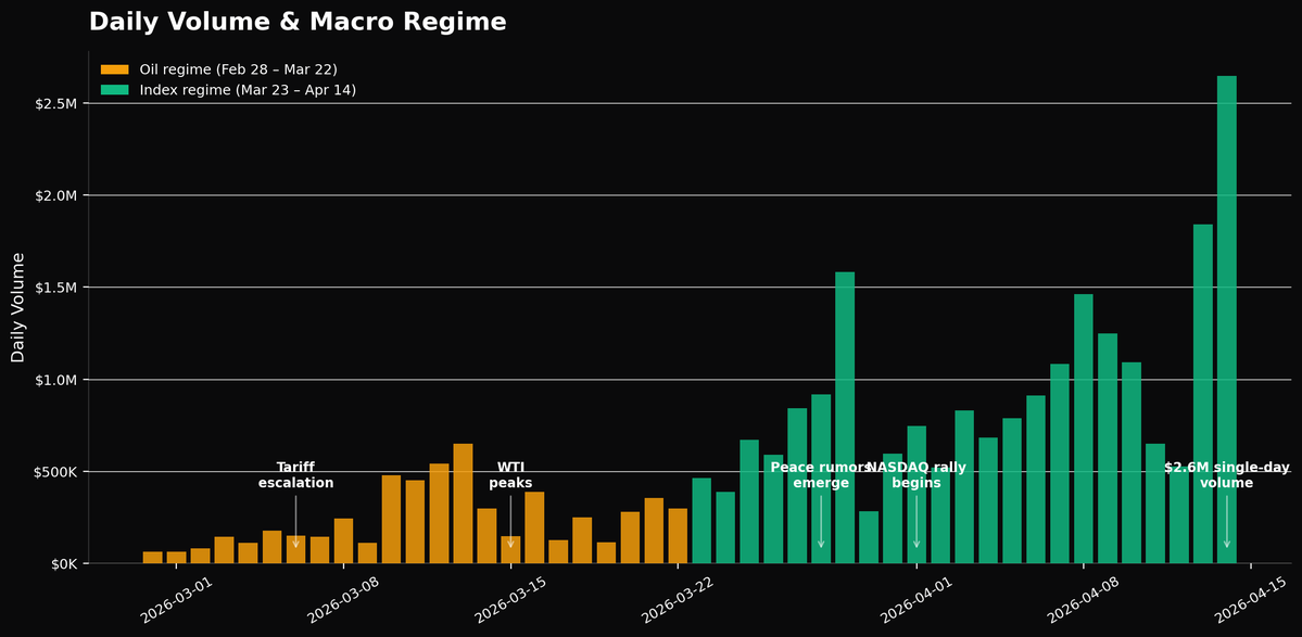 What may be surprising is that the majority of oil-regime PnL actually came from users who entered hours and days later as the escalation deepened. In other words, most of the money was not made on the initial headline but rather the sequence of escalations that came after. Each new development pushed crude higher, and users who read the feed's real-time coverage recognized that each event made the next escalation more likely.