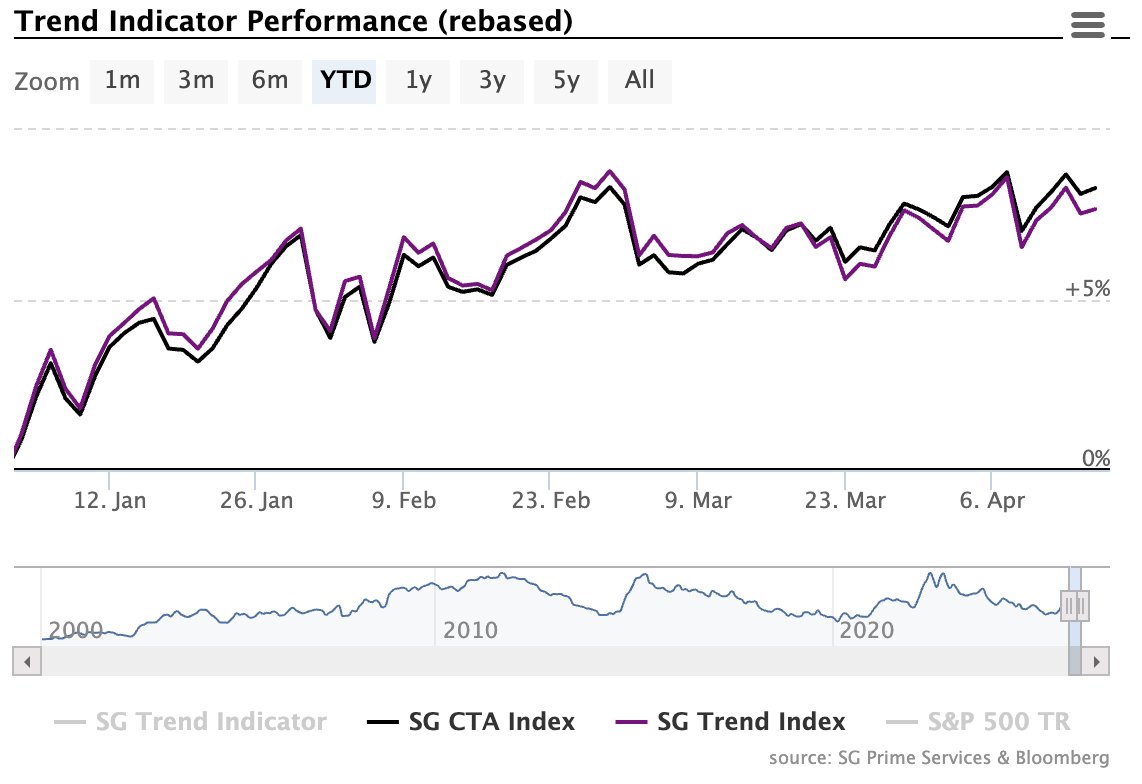 Users traded in the direction of recent price moves. When oil was going up, they went long oil. When indices were rallying, they went long indices. This is momentum; the most robust anomaly in empirical finance, documented by across more than three decades of data. Both the SG CTA Index and the SG Trend Index, broad measures of performance based on trend-following and momentum strategies, has performed well over the last few months.