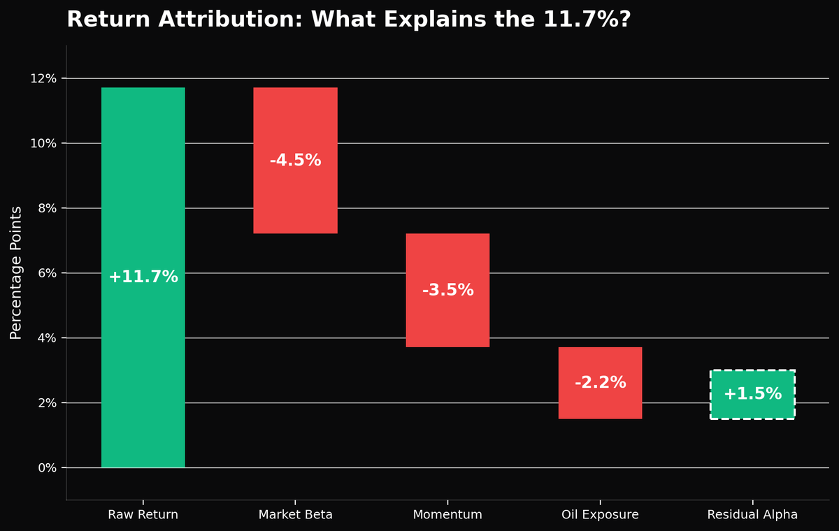 This is real. We do not hide it. If you are long equities during a period when equities rally, you will make money regardless of skill. A basic beta adjustment suggests that roughly 4-5 percentage points of the 11.7% return can be attributed to broad market exposure.